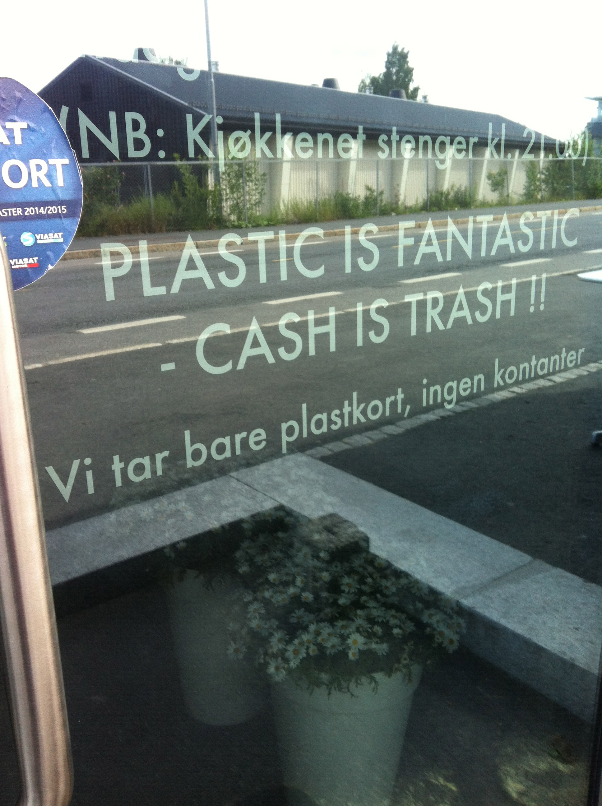 Plastic is fantastic – cash is trash står det skrevet på inngangsdøren til det nye bevertningsstedet (Funkis) i mitt nærmiljø. Hvilket for så vidt er helt greit for meg. Jeg bruker nesten ikke kontanter lenger og har derfor sjelden (for ikke å si aldri) småpenger på meg. Min enste sperre mot å bruke kort, uansett hvor lavt beløpet enn måtte være, har vært om selgeren finner det irriterende at kunder betaler småbeløp med kort. I henhold til Funkis’ forretningsidè synes tydeligvis ikke dèt å være noe problem, kanskje ganske enkelt på grunn av prisnivået. Det skal godt gjøres å gå ut og samtidig komme under hundrelappen.